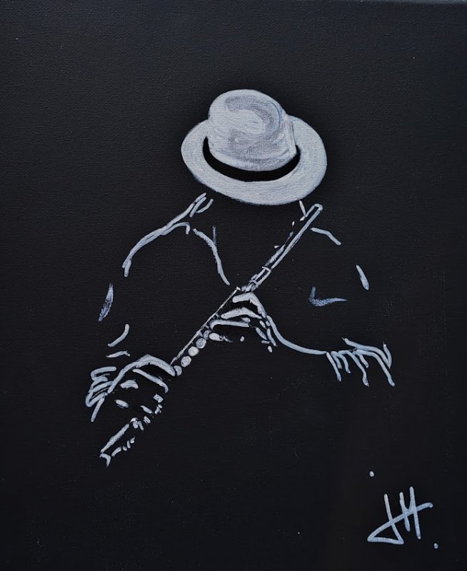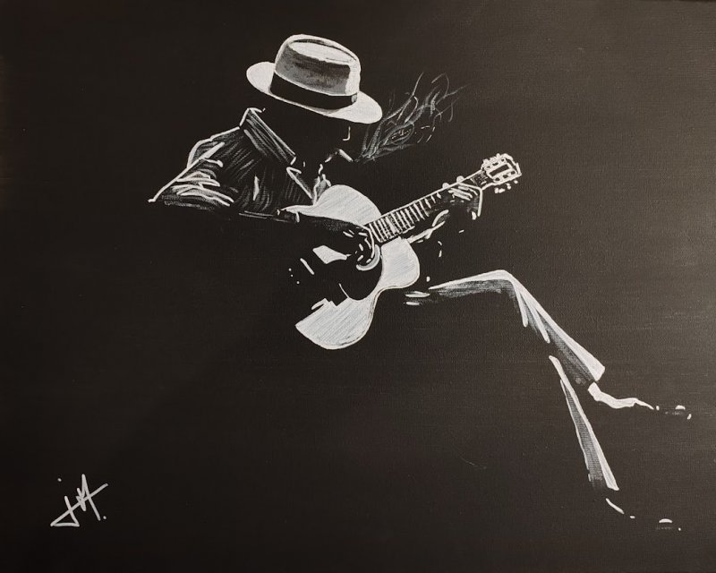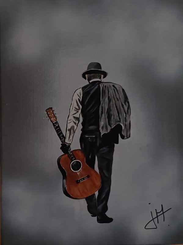Ces silhouettes de musiciens, parfois saisies de dos ou plongées dans leur interprétation, racontent une histoire universelle, celle de l’instant suspendu entre le geste et l’émotion. La guitare, fil conducteur de ces œuvres, n’est pas seulement un instrument – elle est une extension de l’âme, un vecteur de mémoire et de vibration intérieure.