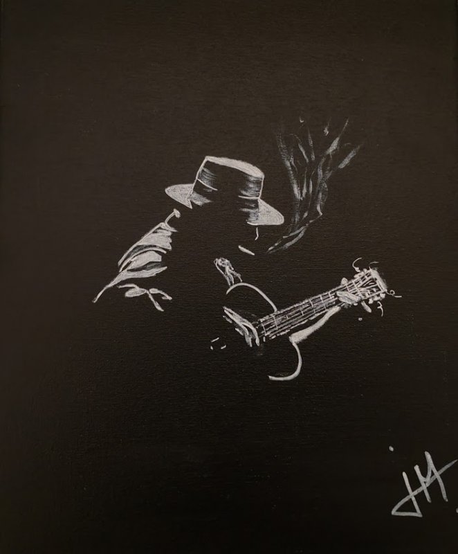 Ces silhouettes de musiciens, parfois saisies de dos ou plongées dans leur interprétation, racontent une histoire universelle, celle de l’instant suspendu entre le geste et l’émotion. La guitare, fil conducteur de ces œuvres, n’est pas seulement un instrument – elle est une extension de l’âme, un vecteur de mémoire et de vibration intérieure.